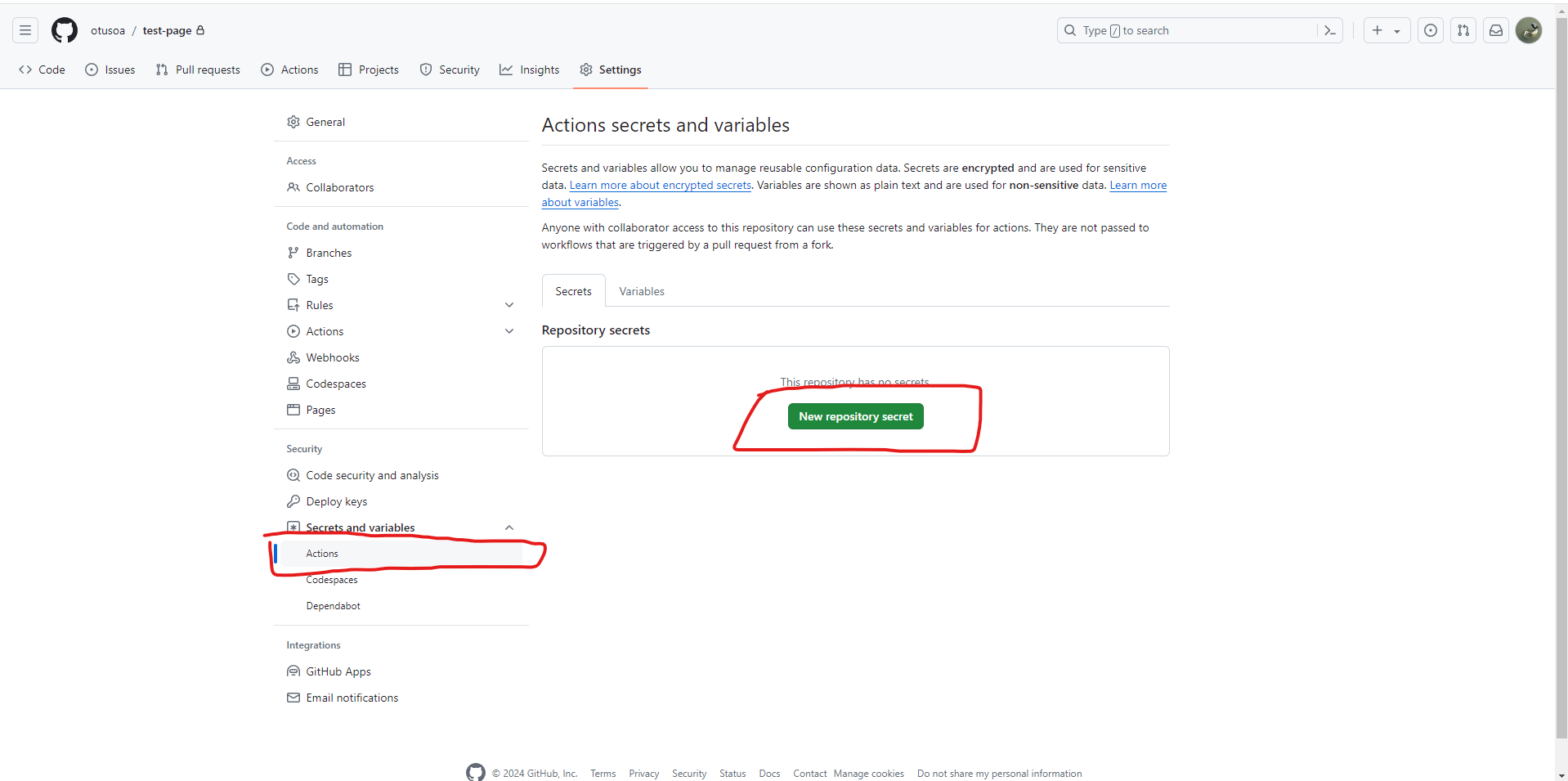 リポジトリの Settings > Security > Secrets and variables > Actions から